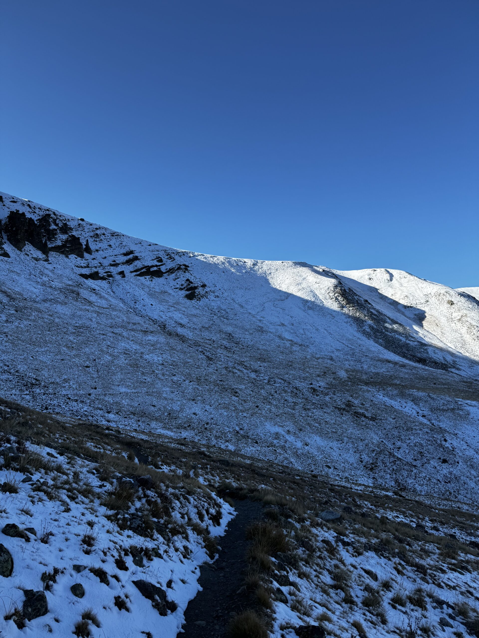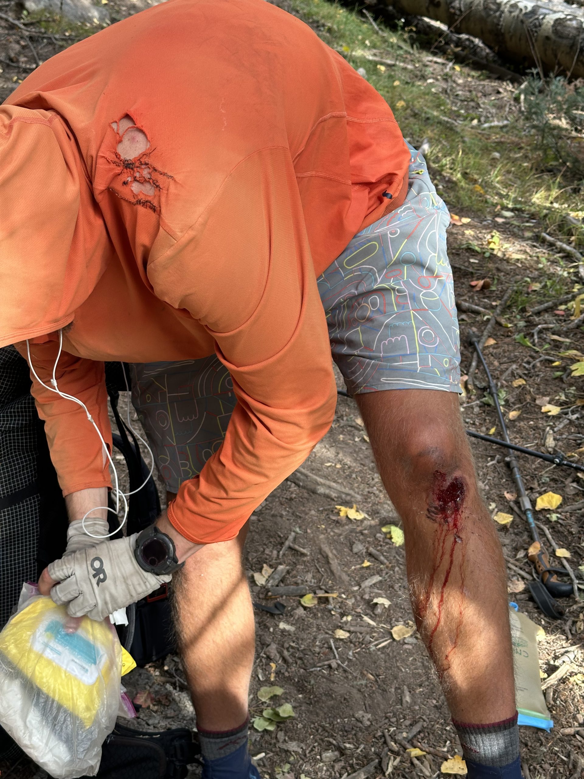 Beautiful morning, great views, feeling good. Got a little cocky. Was spinning my trekking pole in one hand and scrolling through podcasts with the other and then just slipped straight into a rock with my knee. Here’s the knee. You should have seen the rock though. It definitely got the worse end of that.