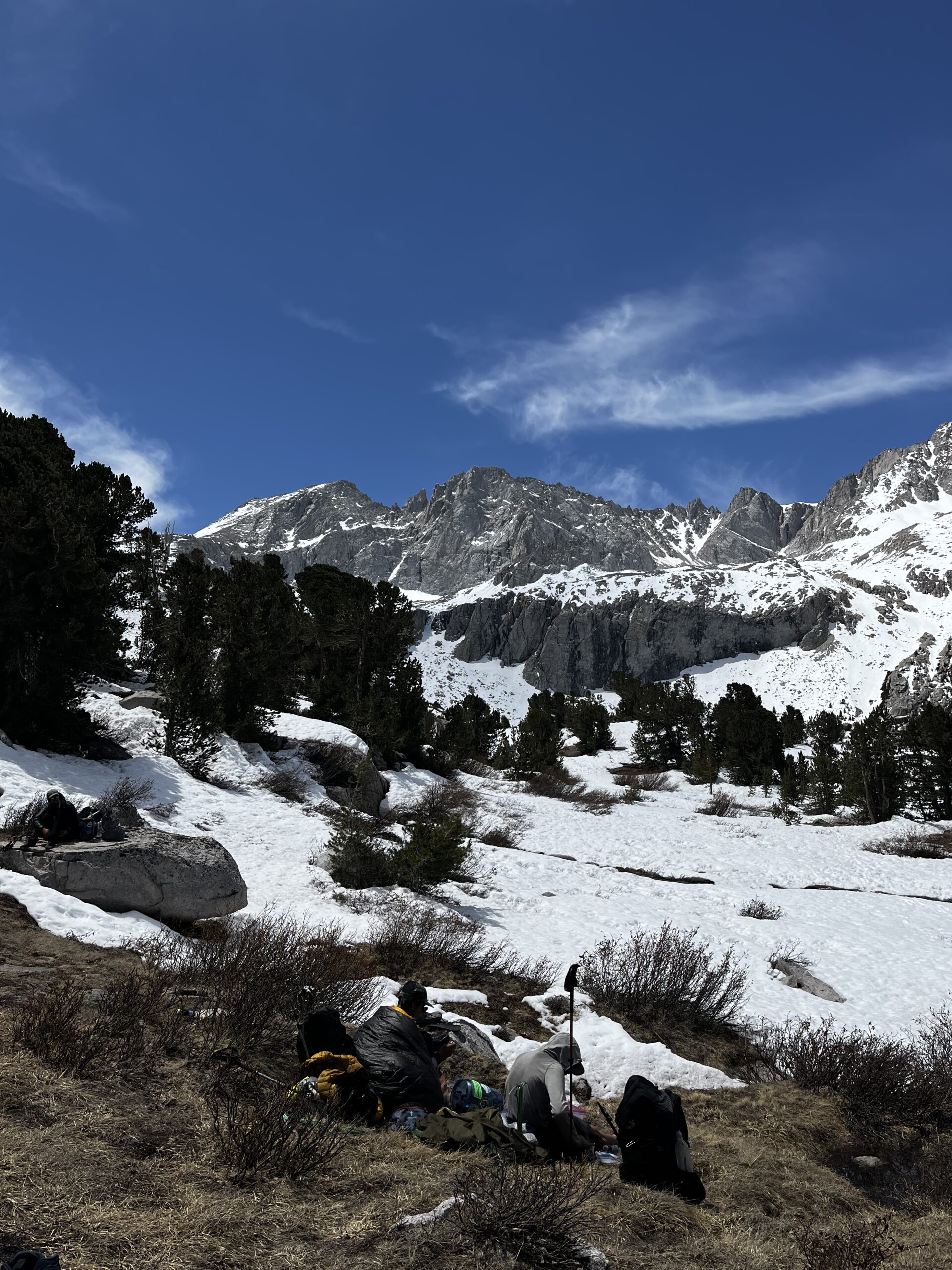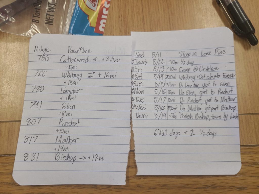 So we were trying to come up with a new plan in Lone Pine. Boogie—he had hiked the Appalachian Trail and the Colorado Trail—was kind of our guide/leader. None of us had much experience before this. He came up with a plan: take it easy, slow. We agreed. Hike 10, 15, 16, 20 miles per day, do a pass every day, camp low, and make sure we’re not stuck on snow.