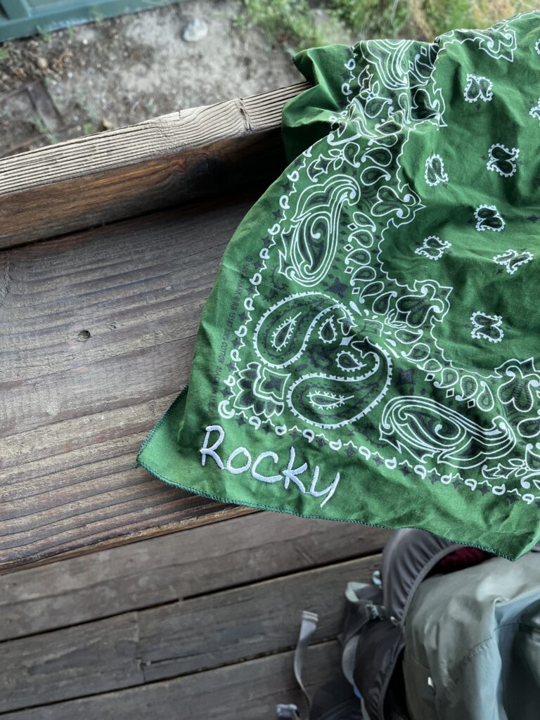 It turns out he didn’t just ship the bear canister. He filled it with Asahi Japanese beer, ibuprofen, snacks, and a beautiful green bandana. His wife embroidered Rocky on it. I couldn’t believe it. This guy has never even met me. We just exchanged a few messages on Facebook. It was one of those moments that reminds you how unexpectedly kind people can be—and how much they’re willing to help a complete stranger on the trail.