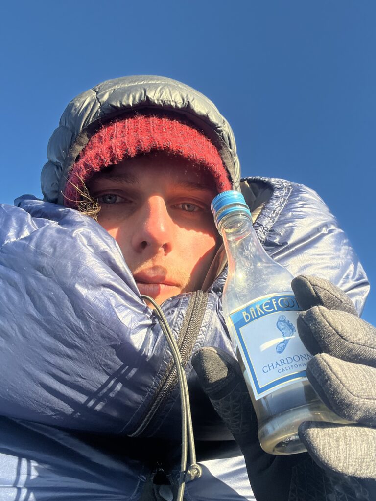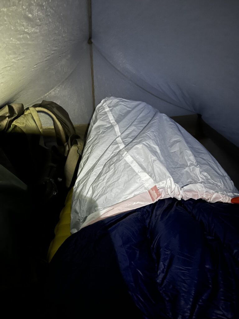 Then the next night it dropped to around negative 10 C / 14 F, I had to improvise—pulled a trash bag over my sleeping bag to keep warm. Didn’t really help, don’t know why I did it. I managed to survive, but it was really cold.
