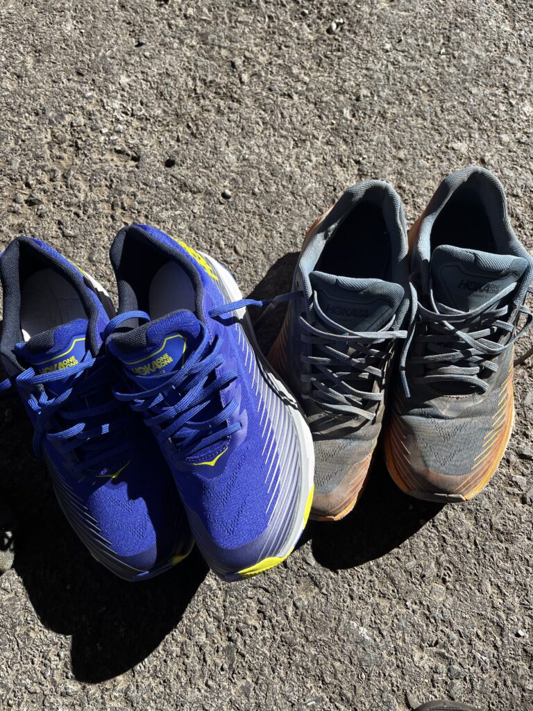 My shoe selection was simple. I was just looking for size 13 US (EU 48) and the cheapest Hoka Torrent version available. Every time I got a new pair, it would be a different color.